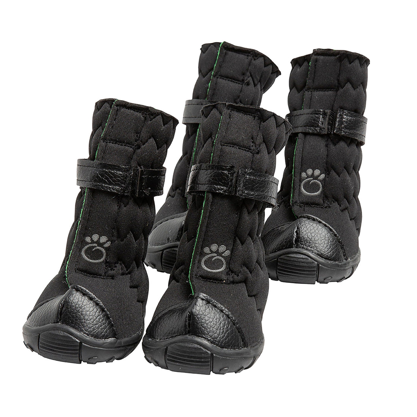 The GF PET® patent-pending Elasto-fit® boots fit your dog's unique paw shape. They are super stretchy, easy to slip on and they have elastics all around an extra-tall shaft to hug more of your dog's leg. Secure them with the extra velcro strap to keep them snug!  The traction control sole helps your dog's paws grip onto ice, snow, rain and pavement. Made of water-resistant neoprene, they can be cut lower to fit shorter legs.